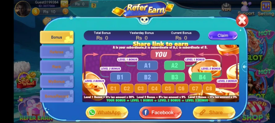 You can invite friends to join and earn bonuses each time they play or deposit.